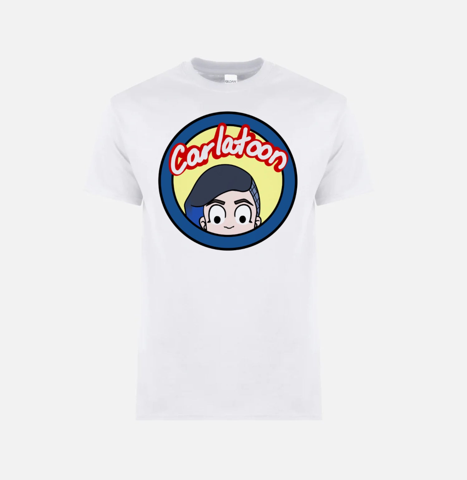 White Cotton t-shirt with Carlatoon Logo printed on the front.