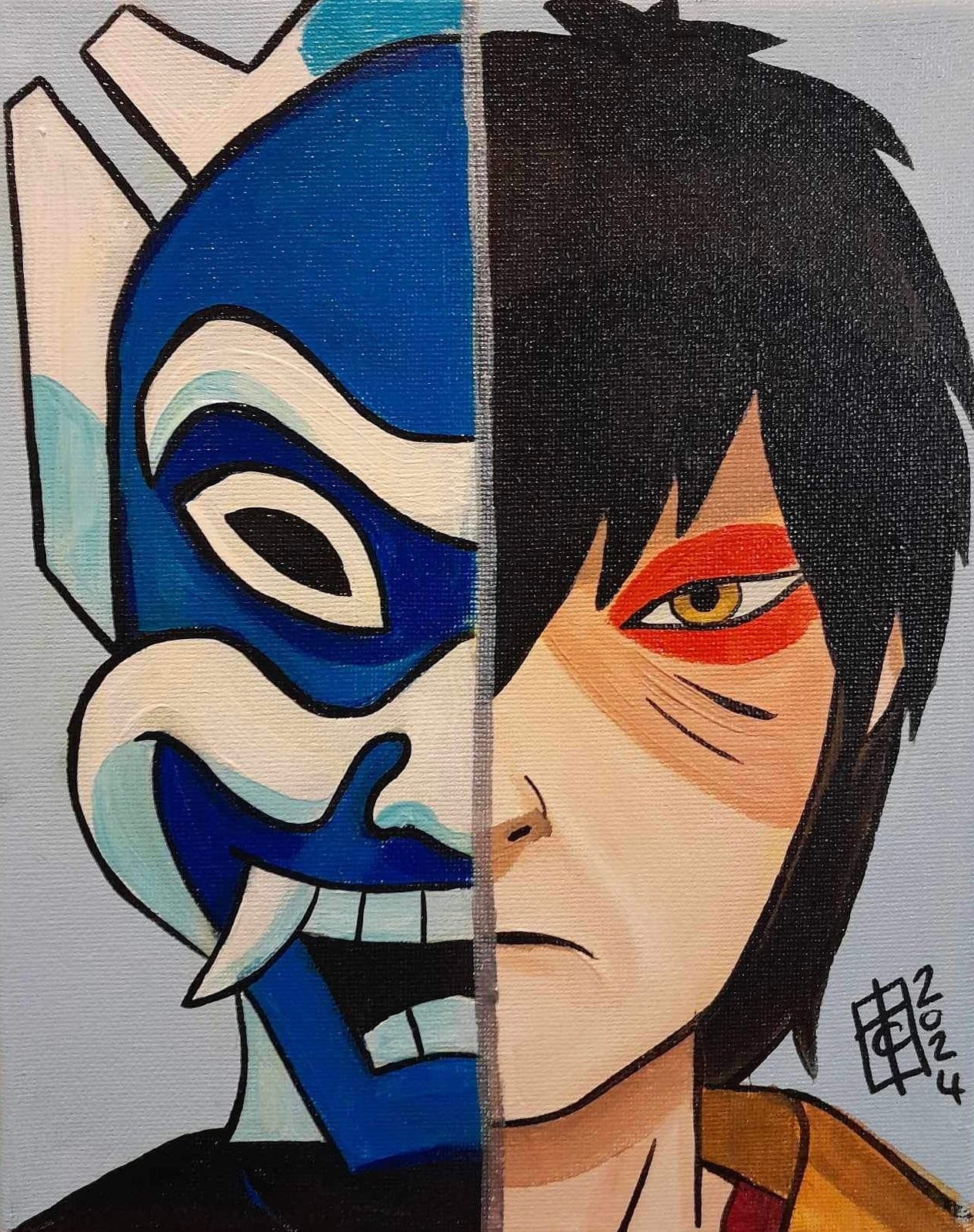 Unleash your inner fire with this hand-painted fan art of Zuko from Avatar by the talented Carla Thornton. Bring the Blue Spirit to life in your home or office and let it inspire you to chase your dreams with determination and passion. (Just don't think about Uncle Iroh's tea for too long!).