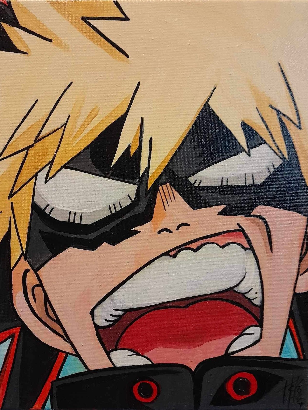 Add some explosive personality to your space with a hand painted Bakugo from My Hero Academia by Carla Thornton. This quirky fan art painting is sure to make a statement and bring some unique charm to any room.