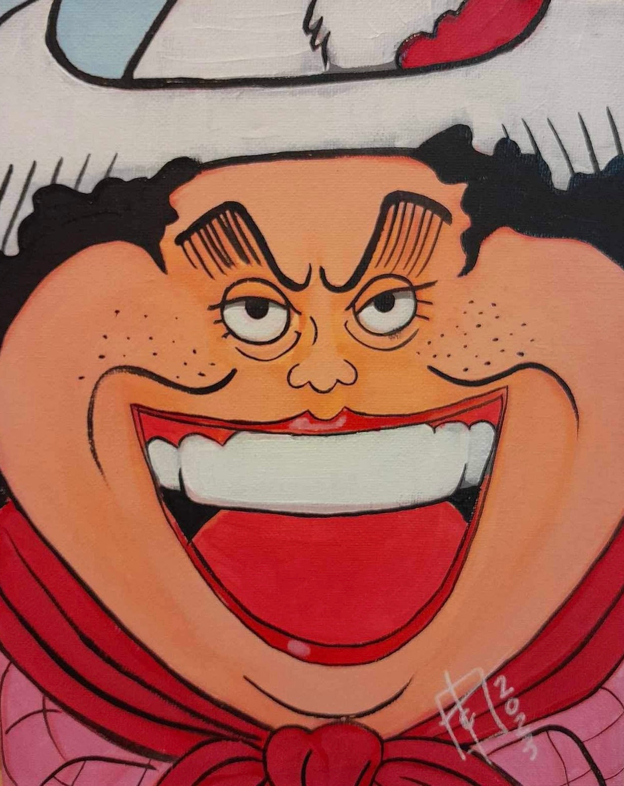 Transform your room into a quirky paradise with this hand painted "Alvida" fan art painting by Carla Thornton! Featuring the iconic character from One Piece, this unique piece brings a touch of humor and personality to any space. Add a pop of fun to your decor with this one-of-a-kind painting.