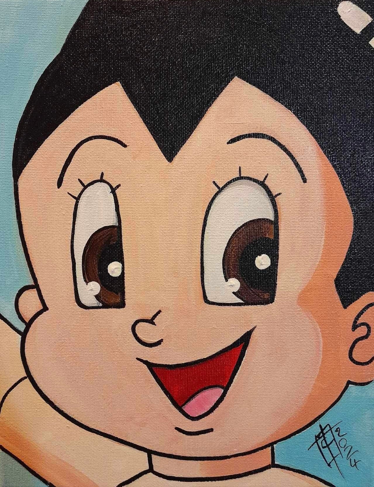 "Add a pop of whimsy to your space with this one-of-a-kind Astro Boy painting by Carla Thornton. Hand painted with love and detail, this fan art piece will bring a playful touch to any room (and impress all your otaku friends)."