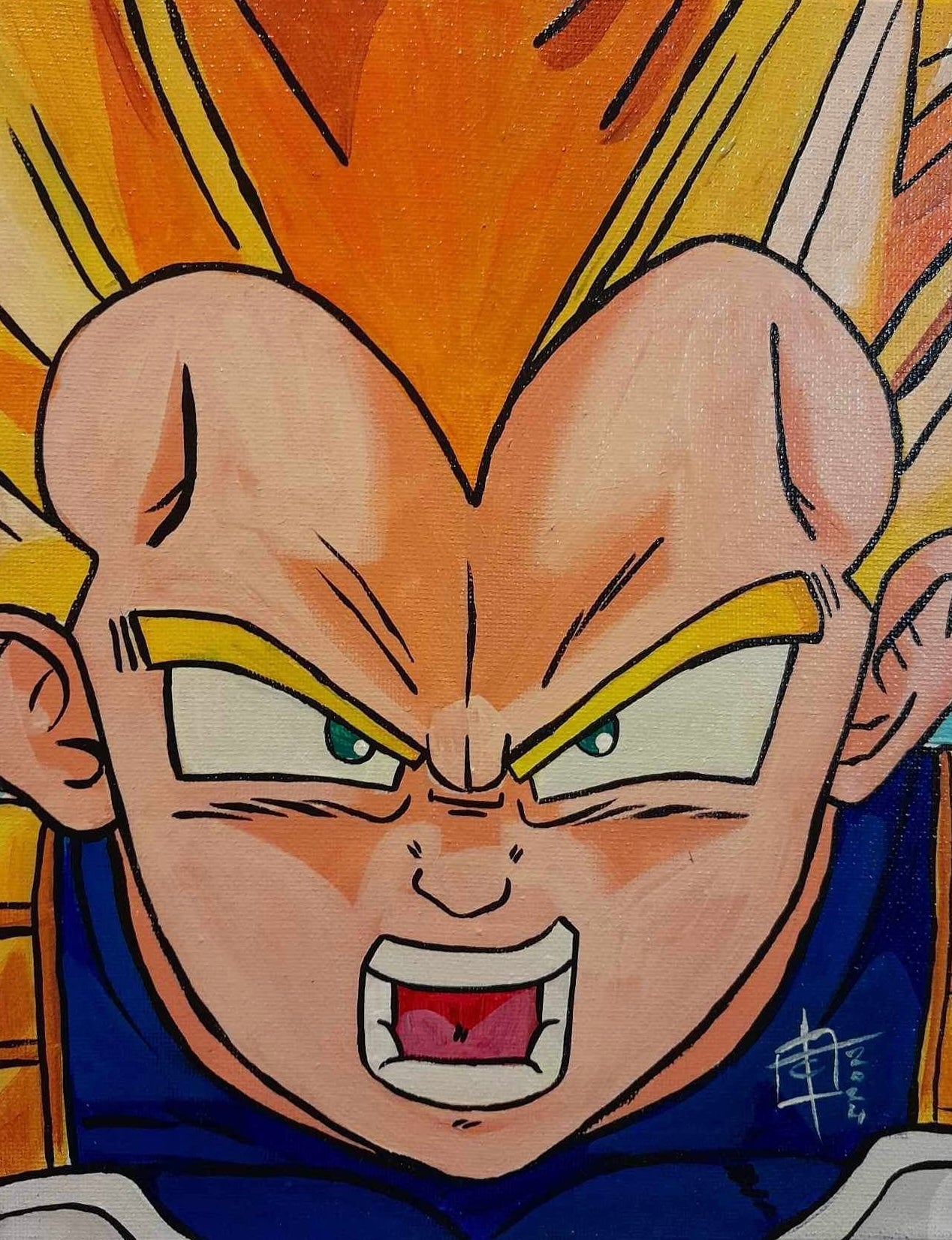 "Get ready to power up your room with this unique painting of Vegeta from the iconic anime series, Dragon Ball Z! Expertly hand painted by artist Carla Thornton, this fan art piece captures Vegeta's fierce determination and strength. Perfect for any anime fan's collection. (Kamehameha not included)."